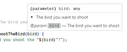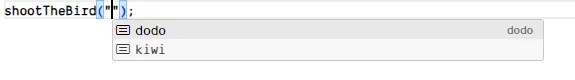 })Now we’ve confirmed this object is an enum while further specifying that it consists of two valid string-values. There's a weird duality in this configuration where defining something as being @type {BIRDS} will evaluate to one of two string, yet using the BIRDS instance will still happily code-hint it's two keys too, for instance BIRDS.DODO.